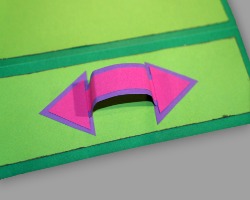 Der Griff und die Eckenschoner befinden sich auf Schablone #10. Dafür verwendete ich zwei Farben, die bisher noch nicht zum Einsatz kamen. Für den Griff klebte ich zunächst die beiden Mittelstücke zusammen, danach wölbte ich das gerade Stück. Dieses gewölbte Stück klebte ich nun zwischen die beiden unterschiedlich farbigen und großen Pfeilhälften.