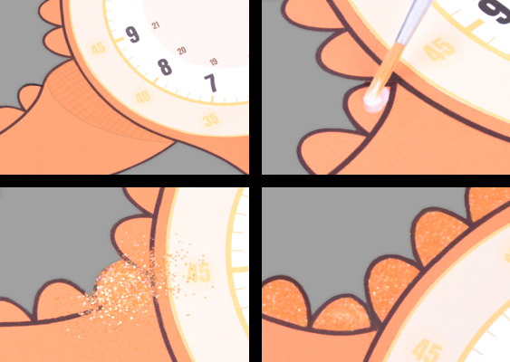 Jetzt darf krea­tiv los­ge­legt wer­den: Glit­zer­stei­ne, Funk­tel­staub und bun­te Stif­te ver­wan­deln den Dino in ein ein­zig­ar­ti­ges Kunst­werk. Zum krö­nen­den Ab­schluss wer­den Zei­ger und Zif­fern­blatt mit ei­ner ma­gi­schen Na­del (aka Steck­na­del) durch­bohrt und mit ei­ner Mus­ter­beu­tel­klam­mer fi­xiert - zack, fer­tig ist die Zeit­ma­schi­ne!