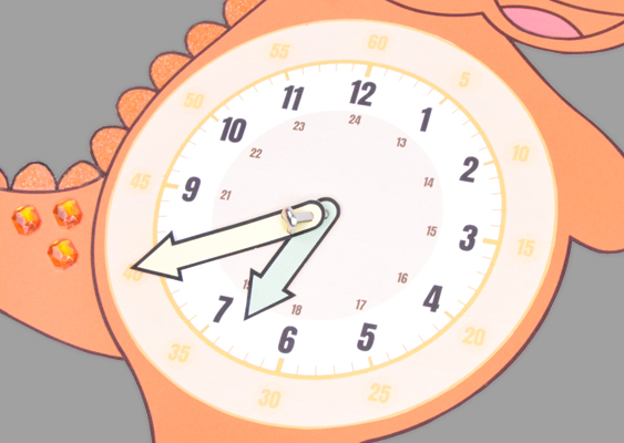„War­um um­fasst ein Tag vier­und­zwan­zig Stun­den, doch das Uhr­werk zeigt le­dig­lich die Zif­fern eins bis zwölf?“, er­kun­dig­te sich der neu­gie­ri­ge Tia­go. Um die­se schein­ba­re Dis­kre­panz auf­zu­lö­sen, ver­fügt mei­ne Dino-Lernuhr über ein Dop­pel­zif­fern­blatt, das so­wohl die Tages- als auch die Nacht­stun­den ab­bil­det.