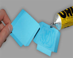 auf ein dunkelblaues Seitenelement. Wichtig: Die Klebelaschen werden zunächst nicht miteinander verklebt. Die beiden langen Seiten klebte ich nun am Grundgerüst meiner Werkzeugkiste fest. Ich bestrich die geöffneten Klebelaschen mit flüssigem Kleber und stülpte diese, links und rechts, um die Bodenlaschen. Dadurch entstehen auf der Unterseite der Kiste später keine Ränder. Auf einer Seite werden abschließend die quadratischen Abstandhalter einfach am Seitenelement angeklebt.